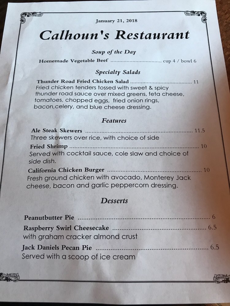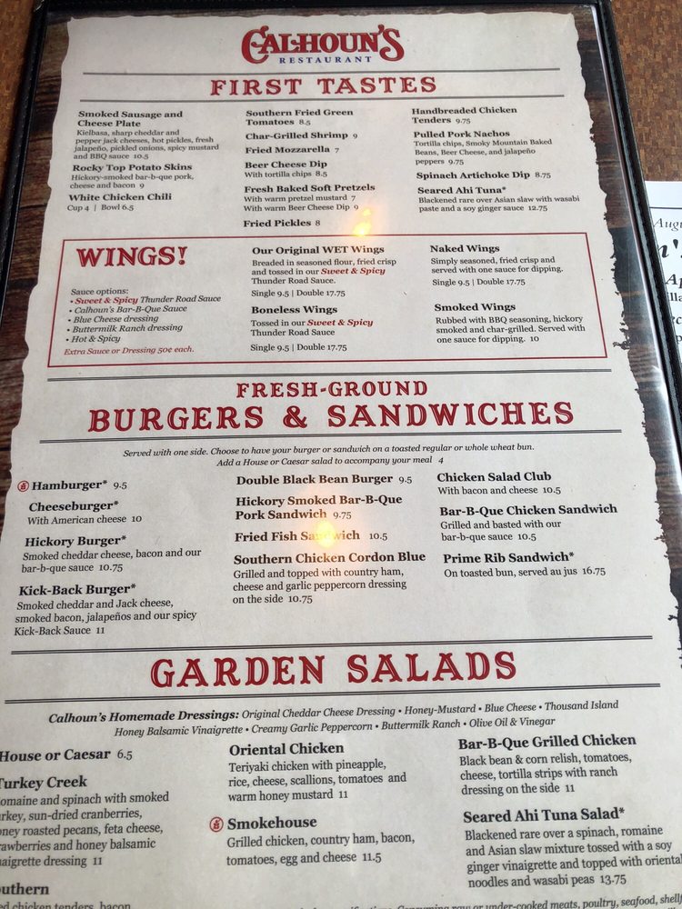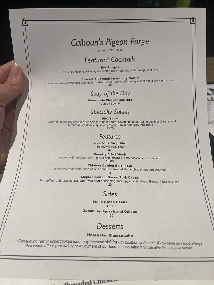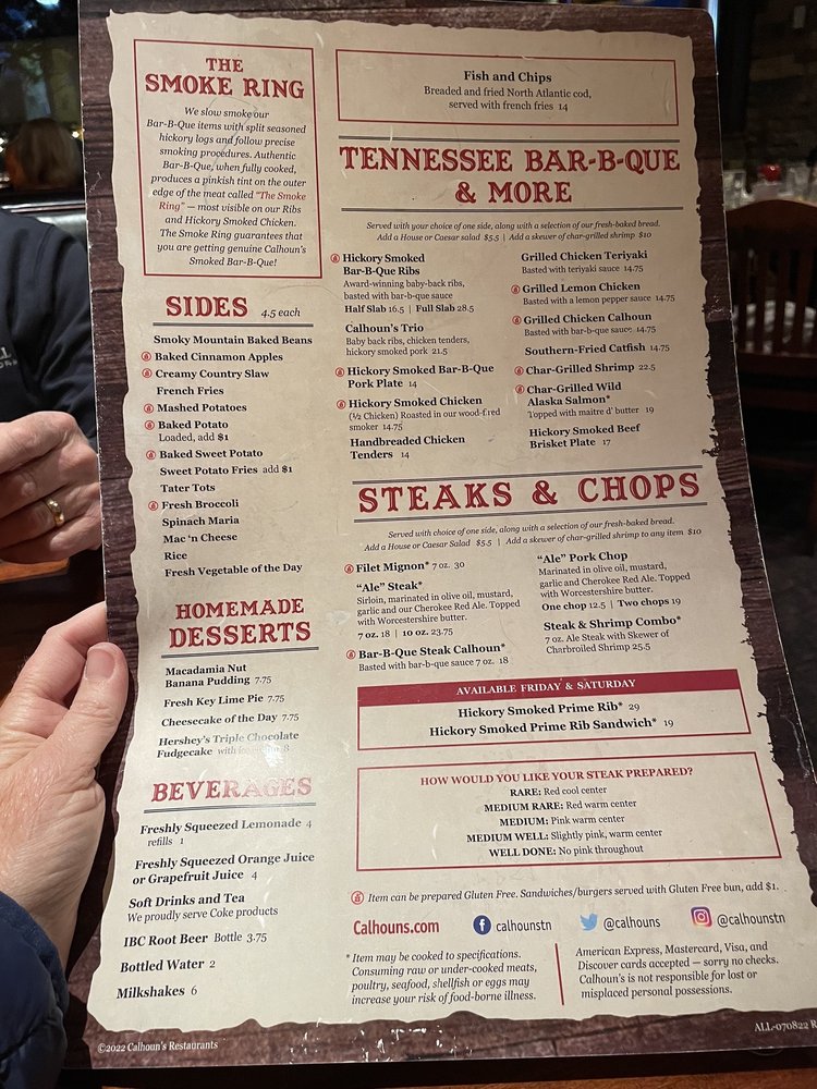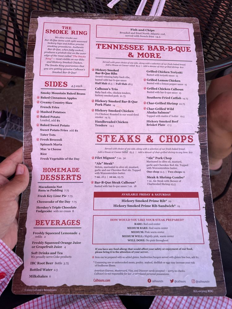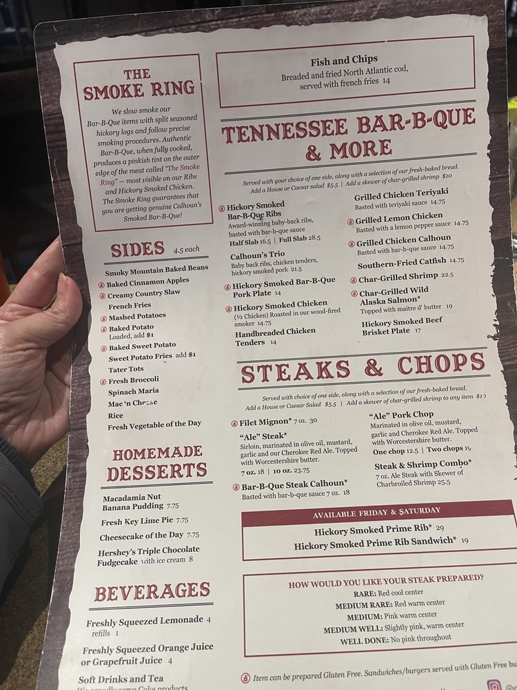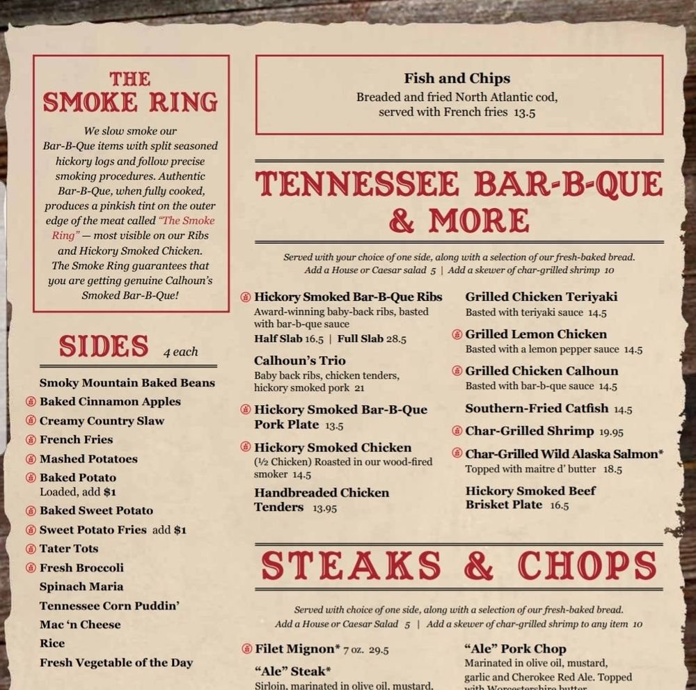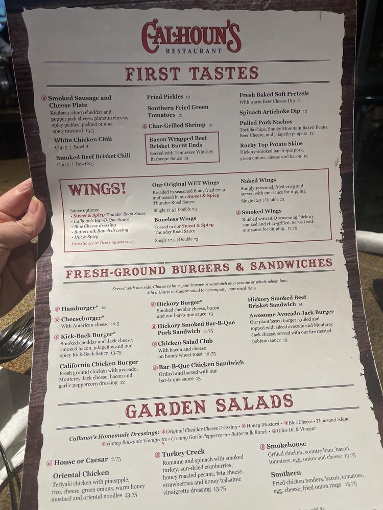 Calhoun's, an American barbeque restaurant located in Pigeon Forge, TN, offers a diverse menu with many vegetarian options. From delicious appetizers like Bacon Wrapped Beef Brisket Ends to flavorful entrees like Wild Caught Alaska Filet Dinners, Calhoun's has something for everyone. The Valentines Dinner for 2 special is a standout, featuring filet mignon dinners with a side dish, grilled shrimp appetizer, double chocolate cheesecakes, and Chateaux Ste. Michelle Champagne. With amenities like free Wi-Fi, outdoor seating, and a full bar, Calhoun's provides a casual and welcoming dining experience. Don't miss out on their savory Boneless Wings and refreshing Garden Salads, making Calhoun's a great choice for any occasion. Call (865) 868-1500 to make a reservation and experience the delicious offerings at Calhoun's.